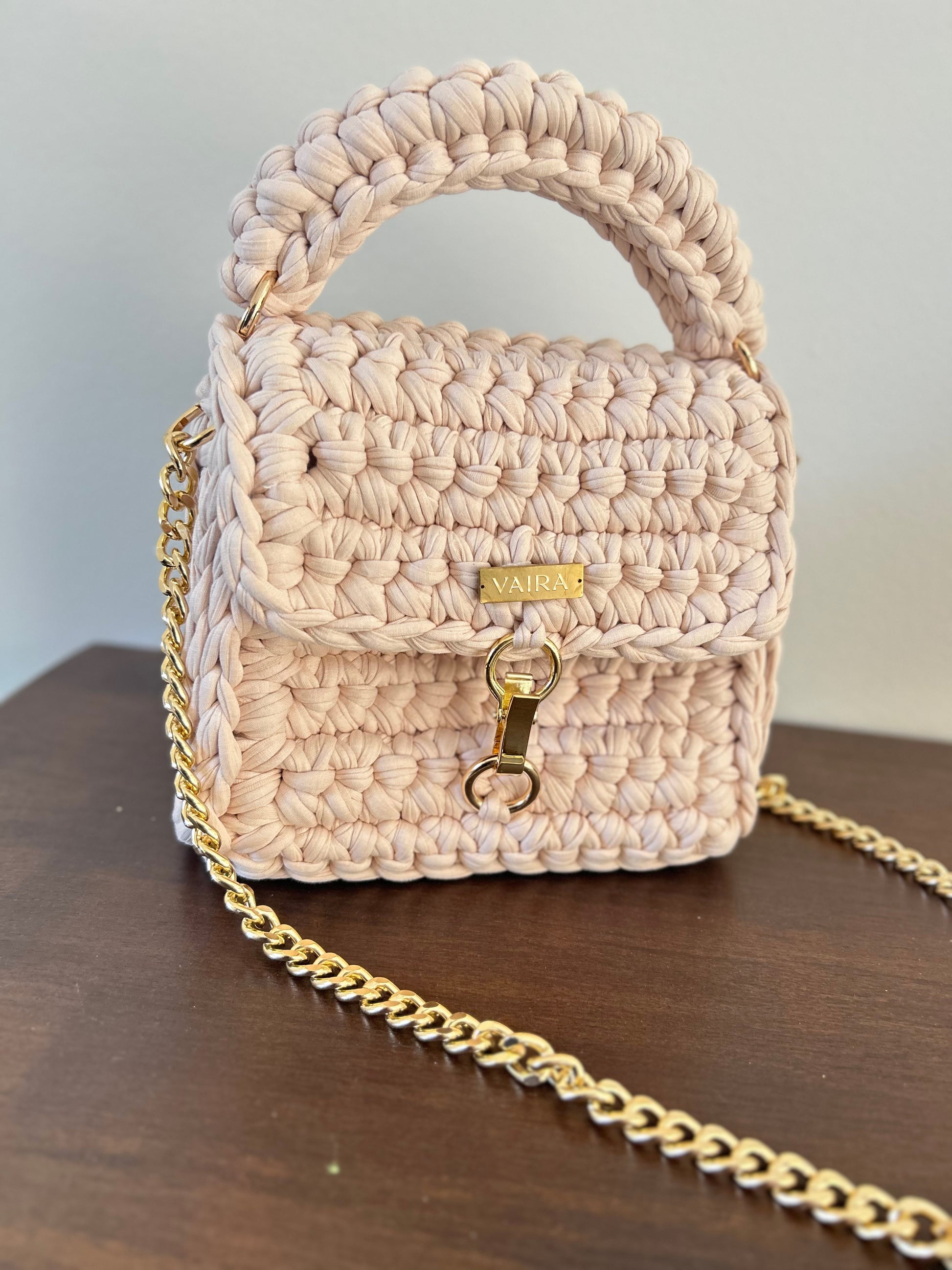 Μία τσάντα που είναι συνώνυμο της κομψότητας. Πλεγμένη εξ ολοκλήρου στο χέρι με εξαιρετική προσοχή στη λεπτομέρεια, διαθέτει μοναδική πλέξη που προσθέτει υφή και χαρακτήρα. Η εκλεπτυσμένη της αισθητική ενισχύεται από την εντυπωσιακή χρυσή αλυσίδα, που λειτουργεί ως λουρί ώμου, προσφέροντας λάμψη και διαχρονική φινέτσα.